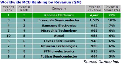 在歡度豐收的2010年后,愛特梅爾(Atmel)、飛思卡爾(Freescale)、Microchip、瑞薩(Renesas)和其它的微控制器供貨商,在2011年第一季的業(yè)務(wù)都回歸到正常的季節(jié)循環(huán)。