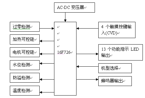 本方案采用美國微芯(Microchip)PIC16F726為主控芯片,主是負責控制豆?jié){機功能及觸摸按鍵,LED顯示,成本低廉,性能穩(wěn)定,工作可靠.